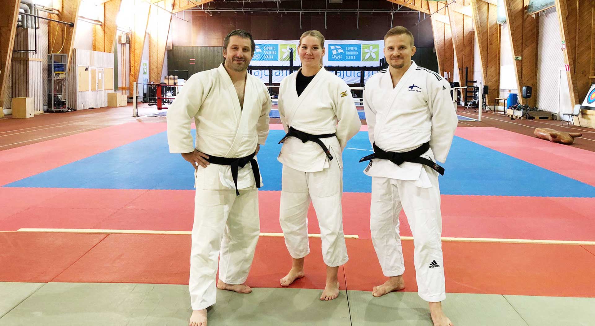 Leirin valmentajat vasemmalta: Ruslan Pinhasov, Jasmine Aho ja Eetu Laamanen (Judoliiton vastuuvalmentaja)