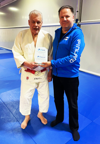 Jorma Kivinen 5.5.2022 Urhean juhlaharjoituksissa Judoliiton puheenjohtaja Esa Niemen palkitsemana (kuvaaja Valtteri Olin).