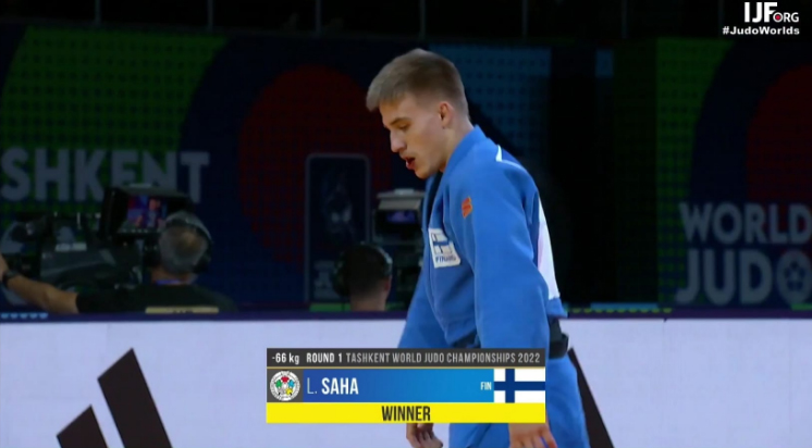 Luukas Saha aloitti päivänsä Judon vuoden 2022 MM-kilpailuiden kivikovassa, alle 66-kuuden kilon sarjassa Brasilian Eric Takabatakea vastaan. Kokenut 31-vuotias brasilialainen on kolminkertainen Pan-Amerikan mestari ja maailmanrankingin 19, joten vastus oli alusta asti kova. Ottelu alkoi tasaisissa merkeissä molempien yrittäessä käsivarsi- ja jalkaheittoja, eivätkä samanpuoleiset – ja tyyliset ottelijat saaneet aikaiseksi eroa toistensa välille.