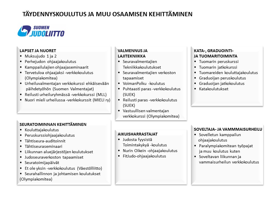 Judoliitto kannustaa jokaista judokaa kehittämään itseään judon harjoittelun lisäksi myös valmennuksen, ohjaamisen, seuratoiminnan tai kata- graduoinnin ja tuomaritoiminnan parissa. Valmentaja- ja ohjaajakoulutukset on jaettu valtakunnallisen VOK-järjestelmän mukaisesti viiteen tasoon, jonka lisäksi tarjolla on vuosittain laaja kattaus täydennys- ja päivityskoulutuksia. Judoliiton koulutuksiin voivat osallistua kaikki Judoliiton jäsenseurojen jäsenet, jotka ovat rekisteröityneet Suomisportiin. Pääset tutustumaan Judoliiton koulutusjärjestelmään alla näkyvästä linkistä.